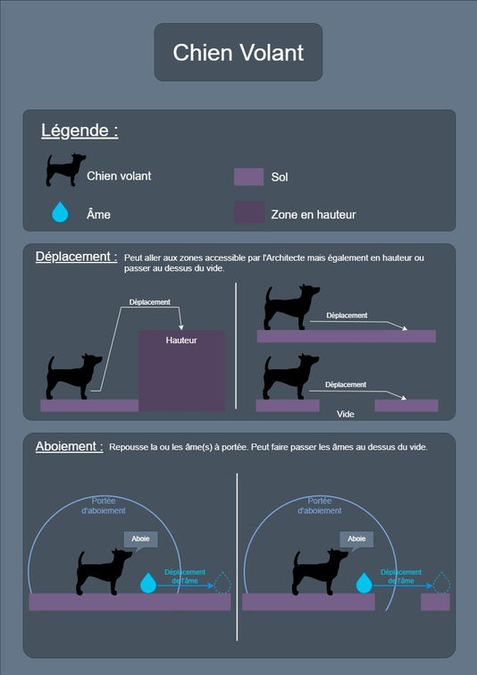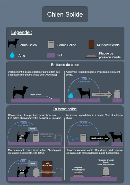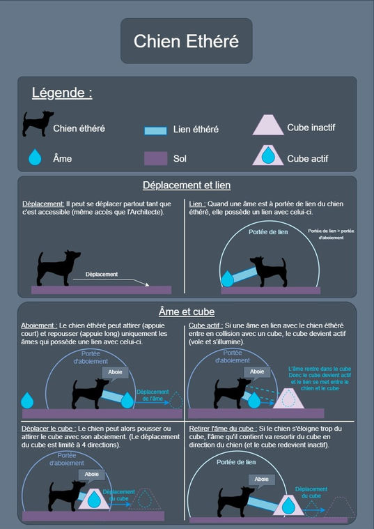 Le concept de base au tout début du projet est : un Architecte possède des chiens qui peuvent déplacer des âmes comme dans un mini golf. Au début, tout les chiens était pareil, ils n'avaient pas de particularités.