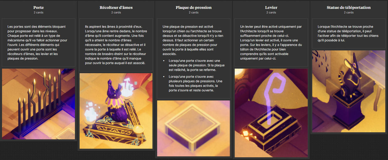 Pour assister l’architecte dans sa mission, Anubis va lui confier trois chiens qui vont l’aider à déplacer et guider les âmes pour activer des mécanismes pour que l’architecte puisse explorer le temple.